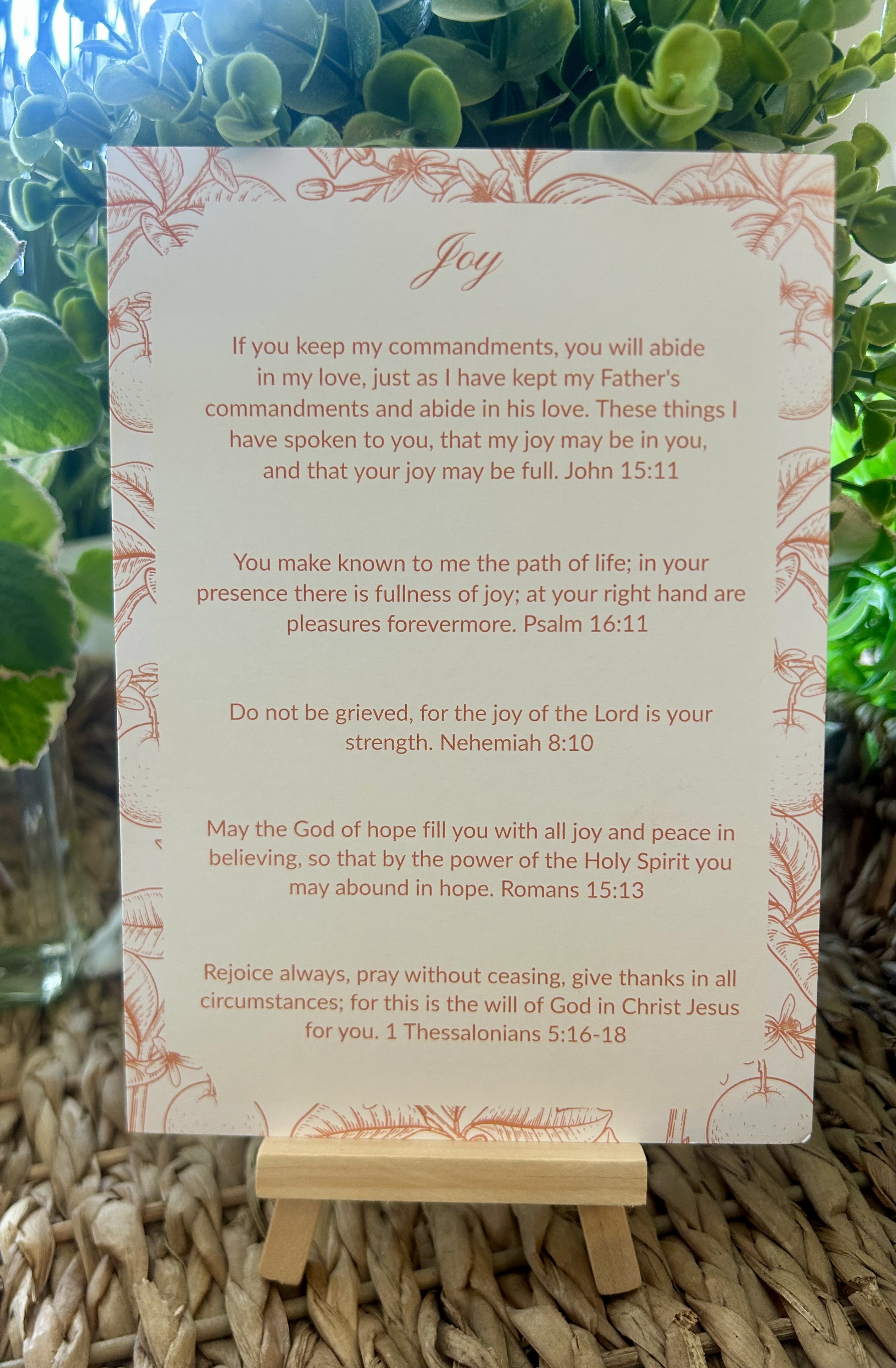 This set of 10 Fruit of the Spirit Scripture cards walks you through every aspect of the Fruit of the Spirit, plus an introduction to the heart behind them. Each card front, printed on quality cardstock, features carefully chosen verses framed in vintage fruit artwork; the back offers a short devotional reflection and a curated song to deepen your time with the Lord.